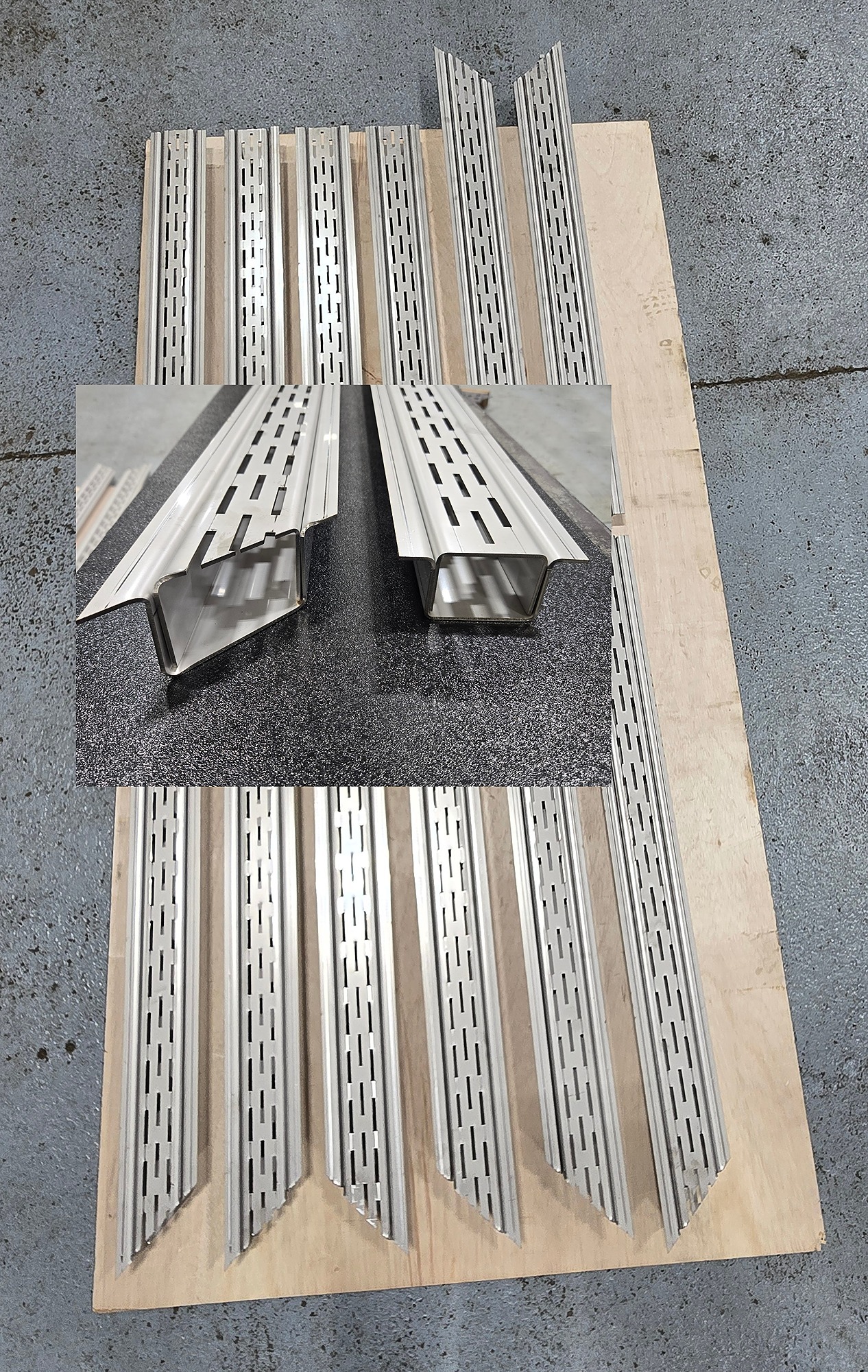 Custom Stainless Steel Floor Drains. The channels are sloped 5 degrees from end-to-end and the ends are coped at 45 degrees to form corners.