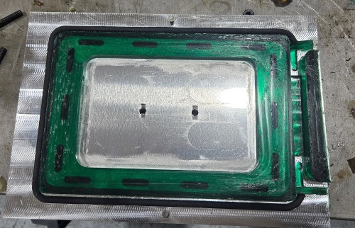 Custom Aluminum Mold producing custom urethane castings that encapsulate an laser cut aluminum part.